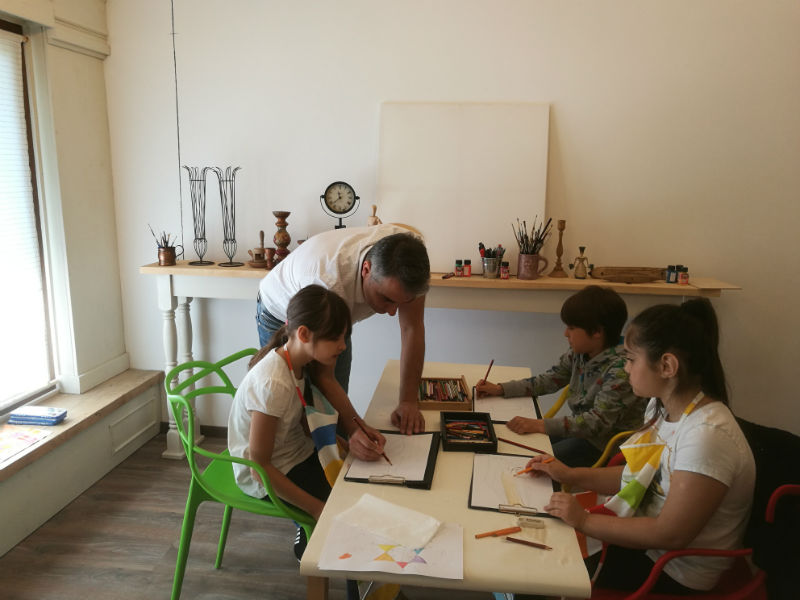 Copiii găsesc în studio toate materialele - hârtie, creioane colorate, acuarele, vopseluri acrilice etc. - și câte un șorțuleț de protecție, astfel încât micii artiști sau părinții să nu aibă nicio grijă. Singura grijă a părinților este să aducă copilul la timp și să revină să îl ia după două ore, la fel de punctual.