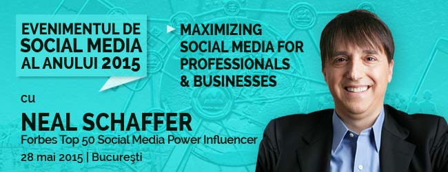 Pe 28 mai 2015 te invitam sa participi la 2 evenimente ce il au in prim-plan pe Neal Schaffer, creatorul platformei de succes "MaximizeYourSocial.com", binecunoscut Keynote Speaker international in social media, inclus timp de 2 ani la rand printre primii 50 cei mai puternici social media influenceri in topul Forbes si unul dintre printre primii 5 social sales influenceri: Conferinta Maximizing Social Media for Professionals and Businesses si Workshopul The Complete Social Media Marketing Workshop.