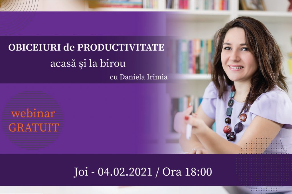 Înscrie-te la Webinarul gratuit “Obiceiuri de productivitate acasă și la birou” ce va avea loc în data de 4 februarie 2021, de la ora 18:00, unde alături de Daniela Irimia, trainer certificat și consultant, vom înțelege care sunt principiile productivității, cum să ne organizăm timpul și activitatea astfel încât obiectivele pe care ni le propunem să devină realitate.